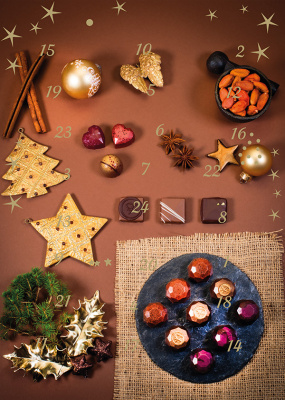 Adventskalender mit 24 Pralinen (zum Teil alkoholhaltig) Zutaten: Kakaobohnen, Zucker, Kakaobutter, VollMILCHpulver, SAHNE, BUTTER, Spirituosen, Fruchtmark, HASELNÜSSE, Glucosesirup, Bourbon Vanille, Gewürze, Emulgator: Lezithin(Sonnenblumen) Produkt kann Spuren von Nüssen und Kernen aller Art enthalten Kakaogehalt: 33% Weiße Schokolade, 42% Milchschokolade; 65 % Bitterschokolade Vor Wärme geschützt lagern Nährwerte je 100g Brennwert 2467kJ/557kcal Fett 40g davon ges. Fettsäuren 19g Kohlenhydrate 47g davon Zucker 43g Eiweiß 7g Salz