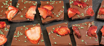 Erdbeere & Minze - Vollmilchschokolade mit getrockneten Erdbeeren & Minze Zutaten: Zucker, Kakaobohnen, Kakaobutter, VollMILCHpulver, ERDBEEREN, Minzecrispies (Zucker, Minze, Gummi Arabicum, Bienenwachs, Farbstoff E141), Emulgator: Lecithin (Sonnenblumen); 52,5 % Kakaogehalt in der Milchschokolade - Kakaosorte: Arriba Nacional - Ecuador Unsere Manufakturschokolade kann Spuren von Nüssen aller Art enthalten. Vor Wärme geschützt lagern Nährwerte je 100g: Energie 2425kJ(581kcal) Fett 43g davon gesättigte Fettsäuren 22g Kohlenhydrate 42g davon Zucker 37g Eiweiß 8g Salz