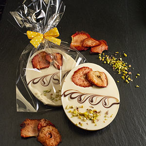 Osterei aus "Bean to Bar" Vollmilchschokolade belegt mit getrockneten Bodensee Erdbeeren und Pistazien